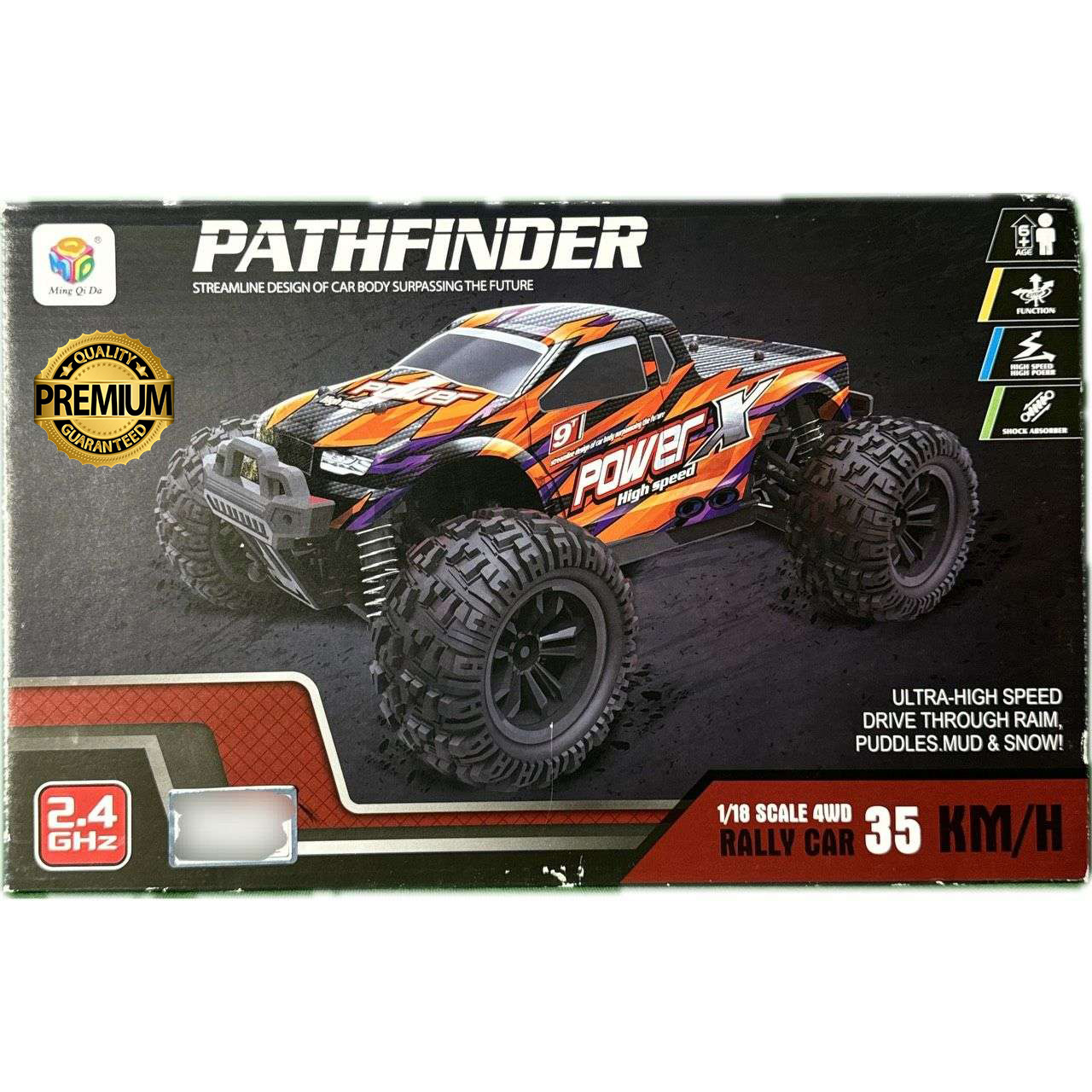 PATHFINDER Power X High Speed RC Rally Car ek premium 1:18 scale 4WD monster truck hai jo speed, power aur control ka perfect combination deta hai. Iska streamline body design aur heavy‑duty tyres isay off‑road racing ke liye ideal banate hain.